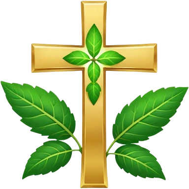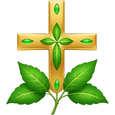 "A clean, friendly emoji of three vibrant green Tulsi (Holy Basil) leaves centered over a small, glowing golden cross or 'plus' sign, symbolizing healing. Simple, flat, 32x32 pixel icon style. Transparent background. Icon for natural healing and wellness." emoji