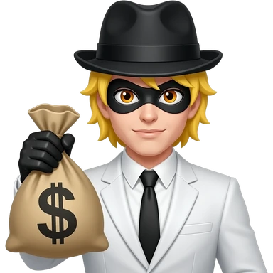 Robber Samsung version He holds a money bag, White and Black suit, Yellow hair,orange eyes and his robber Hat emoji