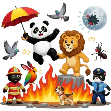 Panda esportista com guarda chuva pulando no leão construtor pra salvar o coelho negro que é um bombeiro no meio do incêndio com papagaios se engasgndo os pombos cantando o gato policial prendeu o cachorro inocente uma explosão atrás um monte de formigas dançando humanos sendo jogados pra lua emoji