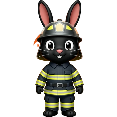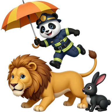 Panda esportista com guarda chuva pulando no leão construtor pra salvar o coelho negro que é um bombeiro emoji