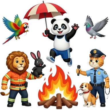 Panda esportista com guarda chuva pulando no leão construtor pra salvar o coelho negro que é um bombeiro no meio do incêndio com papagaios se engasgndo os pombos cantando o gato policial prendeu o cachorro inocente emoji