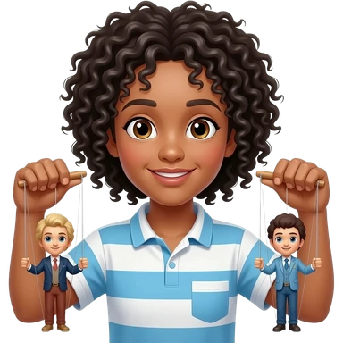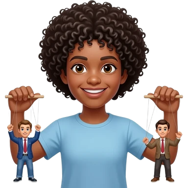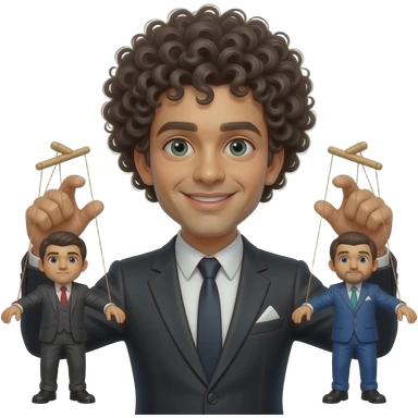 Uomo occhi marroni, capelli ricci che gestisce le sue marionette, una marionetta coi capelli biondi E occhi azzurri, l’altra capelli ricci e occhi marroni tutti e 2 maschi emoji