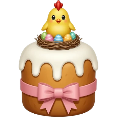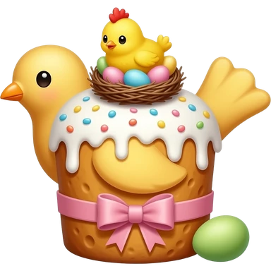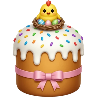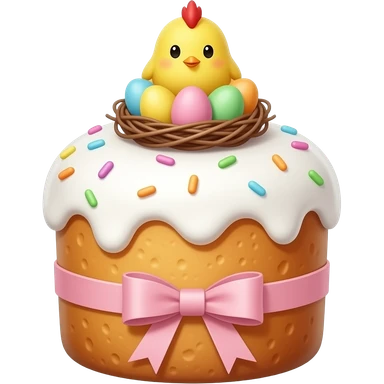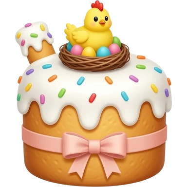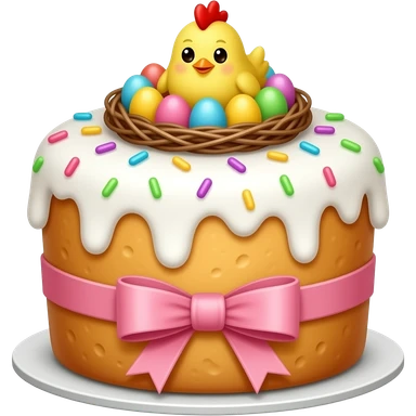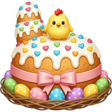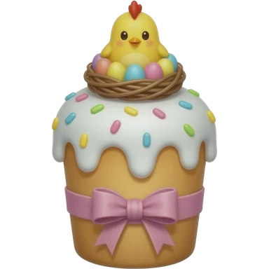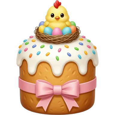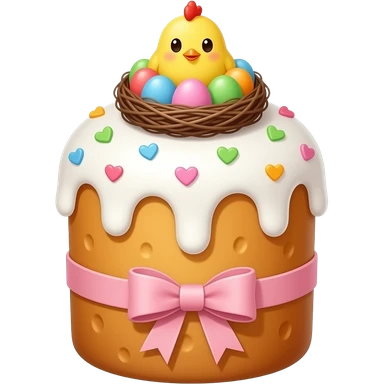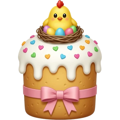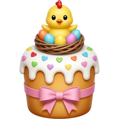 Выпечка итальянская золотистого цвета, высокий, с белой глазурью с разноцветной посыпкой в форме сердечек, с ленточкой вокруг светло розового цвета и украшением сверху в виде гнездышка с очень мелкими яичками пастельных, желтым пушистым птенчиком с красным гребешком emoji