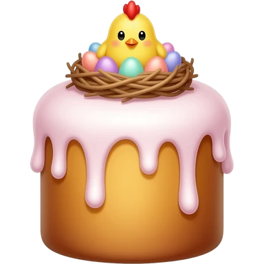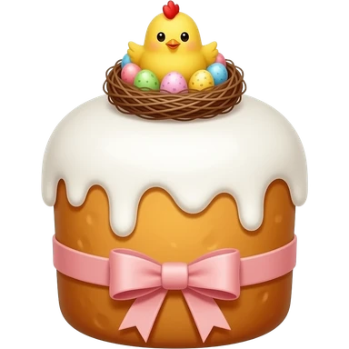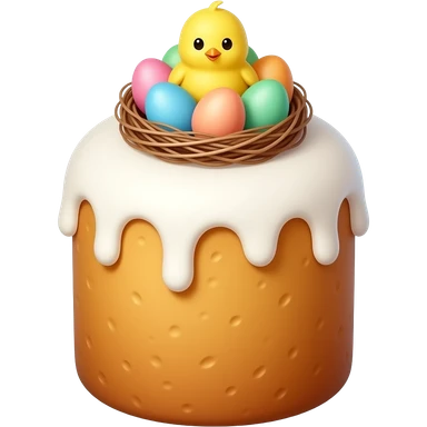 панеттоне золотистого цвета, высокий, с белой глазурью и украшением сверху в виде гнездышка с очень мелкими яичками пастельных, желтым пушистым цыпленком emoji