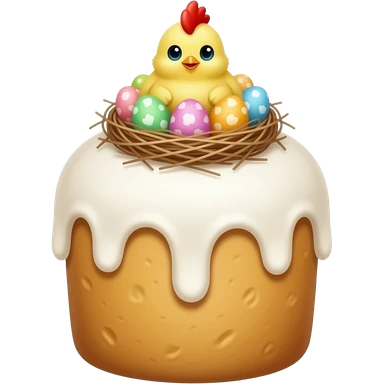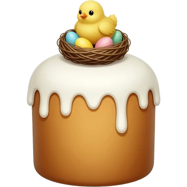 панеттоне золотистого цвета, высокий, с белой глазурью и украшением сверху в виде гнездышка с очень мелкими яичками пастельных, желтым птенчиком emoji