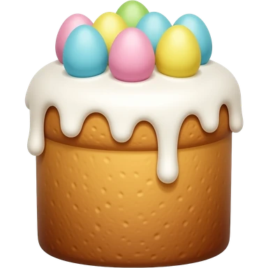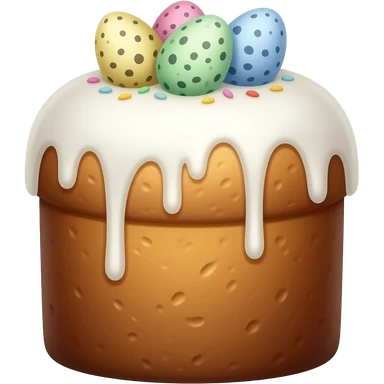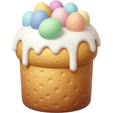 панеттоне золотистого цвета, высокий, с белой глазурью и украшением сверху с очень мелкими яичками пастельных тонов emoji