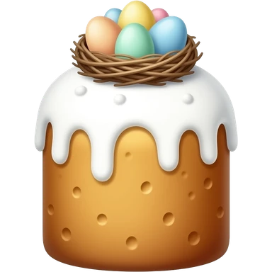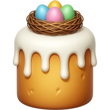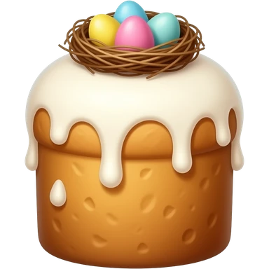панеттоне золотистого цвета, высокий, с белой глазурью и украшением сверху в виде гнездышка с очень мелкими яичками пастельных тонов 7 штук emoji