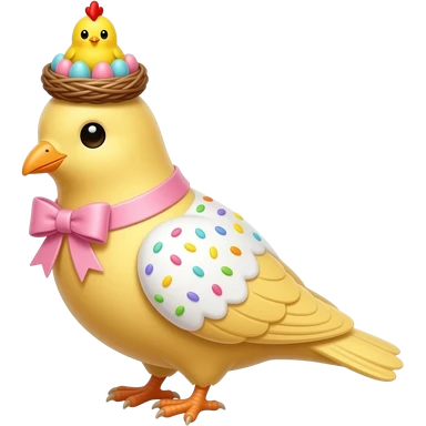 панеттоне в форме голубя золотистого цвета, высокий, с белой глазурью с разноцветной посыпкой, с ленточкой вокруг светло розового цвета и украшением сверху в виде гнездышка с очень мелкими яичками пастельных, желтым пушистым птенчиком с красным гребешком emoji