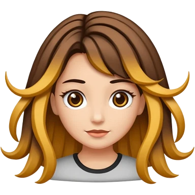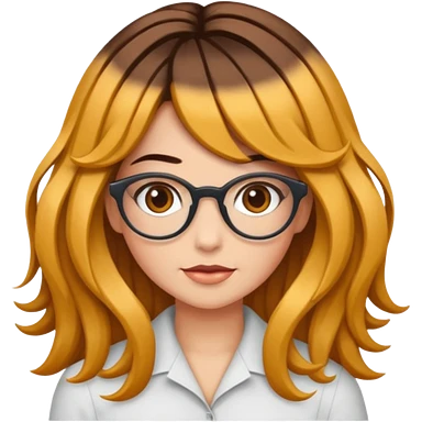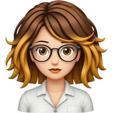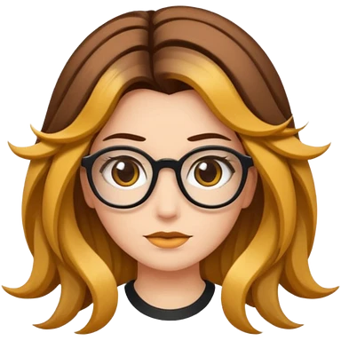 Uma garota de cabelos encaracolados compridos e mechas bem loiras, com pele morena e óculos emoji