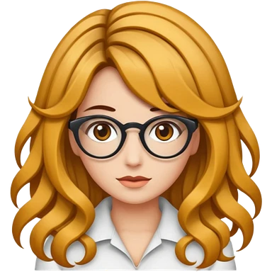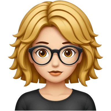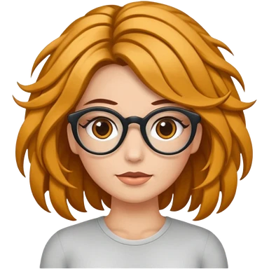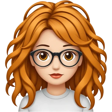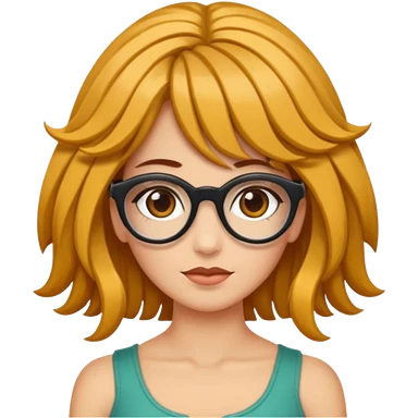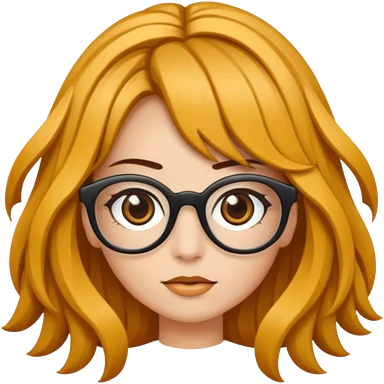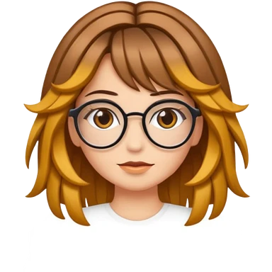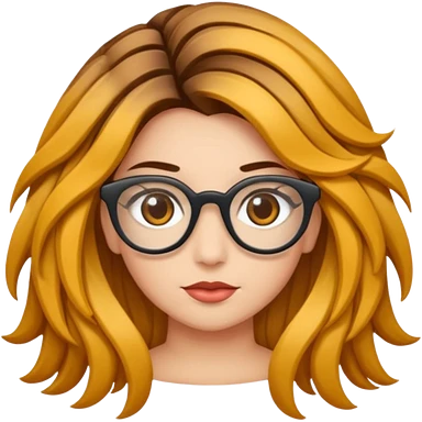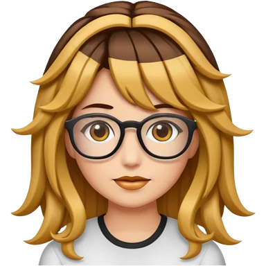Uma garota de cabelos cacheados compridos e mechas loiras, com pele morena clara e óculos emoji