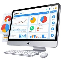 A digital CRM system interface with charts, contacts, messages, and analytics on a computer screen emoji