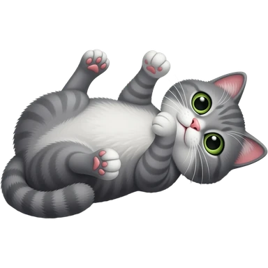 Pisica gri plin cu ochi verzi și fata rotundă care stă în fund emoji