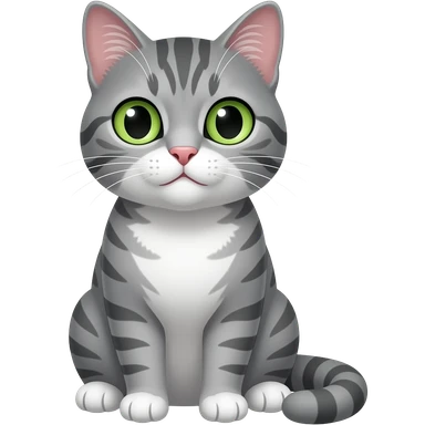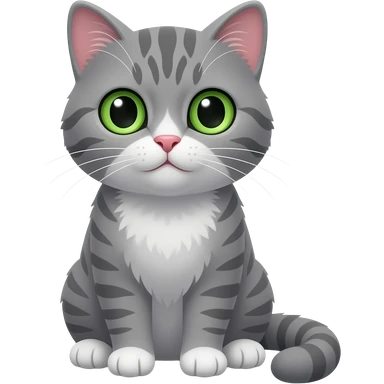Pisica gri cu ochi verzi și fata rotundă care stă în fund emoji