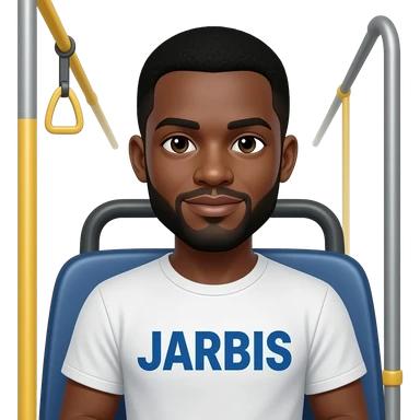 Make an emoji of a black man with the word, JARBIS written on his shirt riding the bus emoji