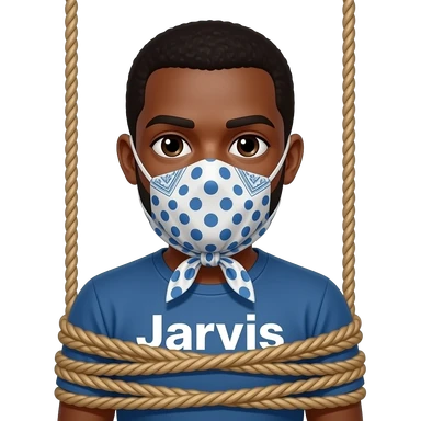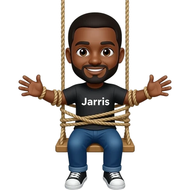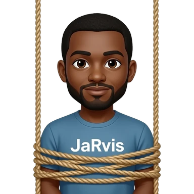 Make an emoji of a black man tied up in a sex swing with a word Jarvis on his shirt emoji
