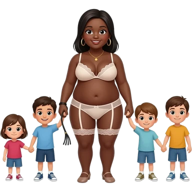A fat black lady in lingerie with whip and six kids standing behind her emoji
