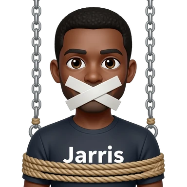 Make an emoji of a black man tied up in a sex swing with a word JARVIS on his shirt and his mouth taped shut emoji