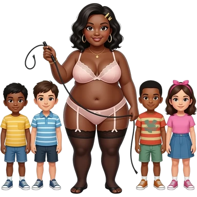 A fat black lady in lingerie with whip and six kids standing behind her holding hands emoji