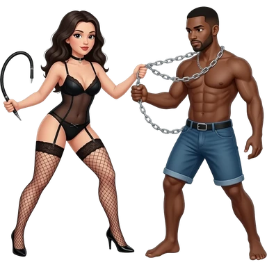 A black lady in lingerie with whips and chain beating a naked, black man emoji