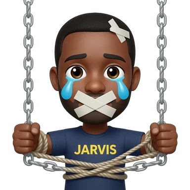 Make an emoji of a black man tied up in a sex swing with a word JARVIS on his shirt and his mouth taped shut with tears coming out his eyes and a knot on his head emoji