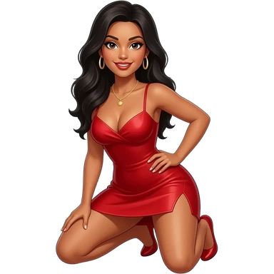 Make an emoji of a dark skin Latino female with long black hair, wearing a sexy red dress twerking with her hands on her knees emoji