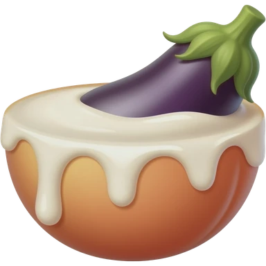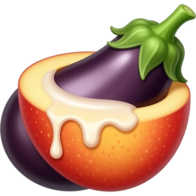 Eggplant peach emoji with white cream dripping from peach but eggplant not going through the peach but in it and a lot of cream emoji