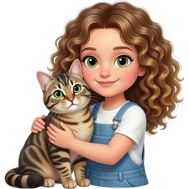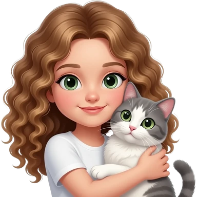 A girl with curly brown and blonde hair with white skin hugging a european cat whit green/grey eyes emoji