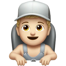 Young white man in baseball hat rocking a white baby in puffy grey rocker emoji