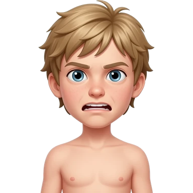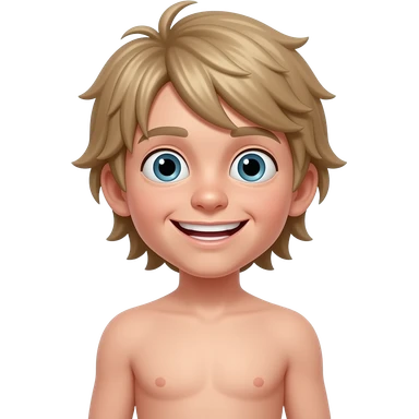 full body no shirt a short white kid kid with meidonm long dirt blond hair and he has buck teeth and has a stupid exsprsion on he's face emoji