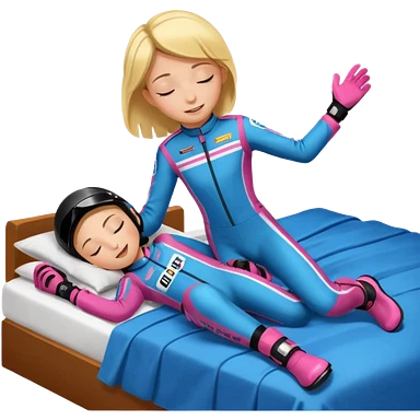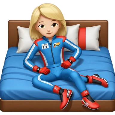 ten-year-old girl in a racing suit, racing shoes and racing gloves with no helmet, unzipped, sleeping on a bed happily, flat-chested and prepubescent emoji