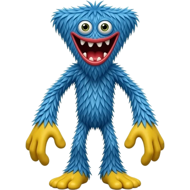 Monstro azul peludo com braços e pernas longos, boca vermelha gigante, dentes afiados, grandes e estilo emoji assustador inspirado no Huggy Wuggy emoji