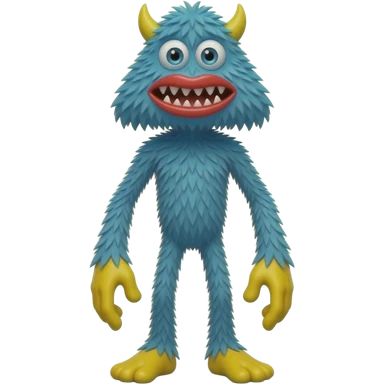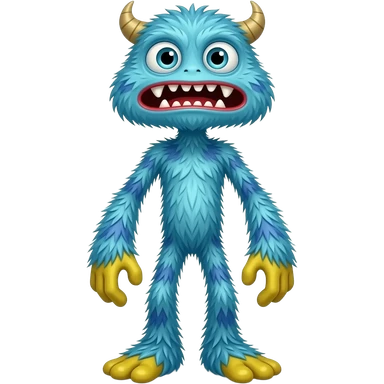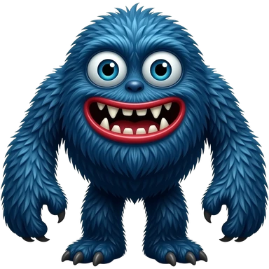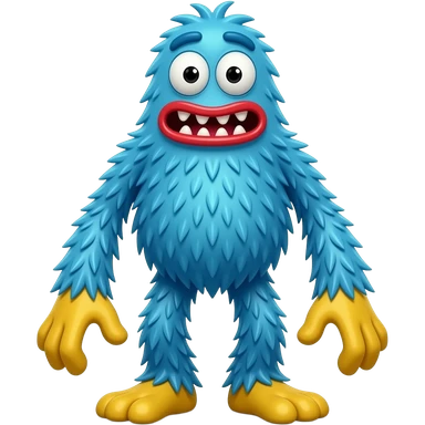 Monstro peludo azul, alto e magro, com rosto triangular invertido, olhos grandes, lábios vermelhos e dentes afiados. Tem mãos e pés grandes amarelos, membros longos, torso visível, pelos azuis desgrenhados em estilo cartoon e expressão assustadoramente divertida. emoji
