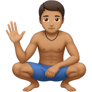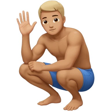 A man squatting down and holdig his hand flat a bit above the ground emoji