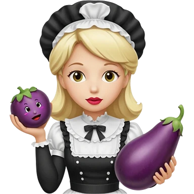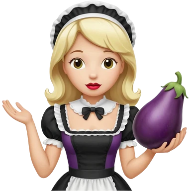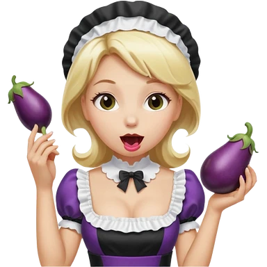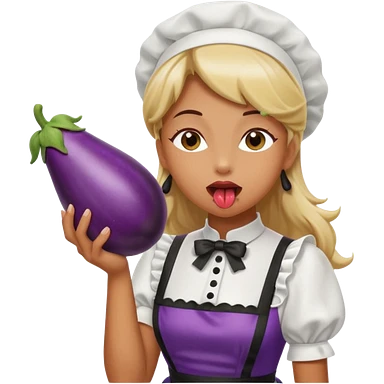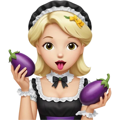 A women with blond hair in a black and white maid dress, licking an eggplant emoji