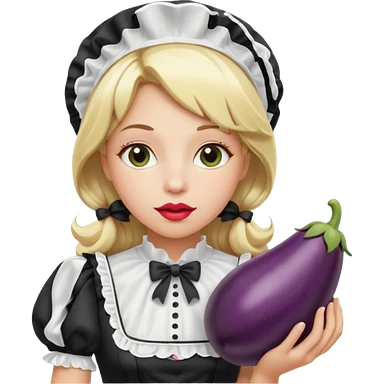 A women with blond hair in a black and white maid dress with her lips around a eggplant emoji