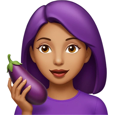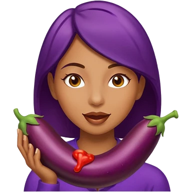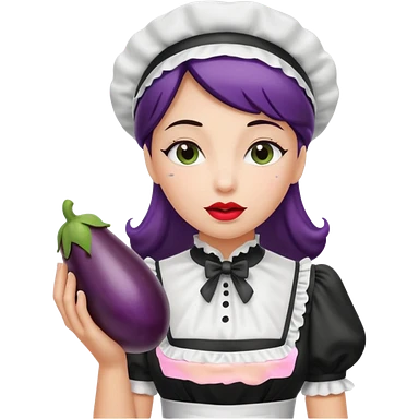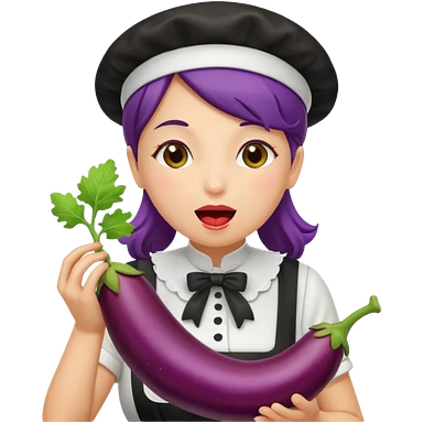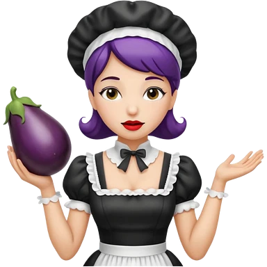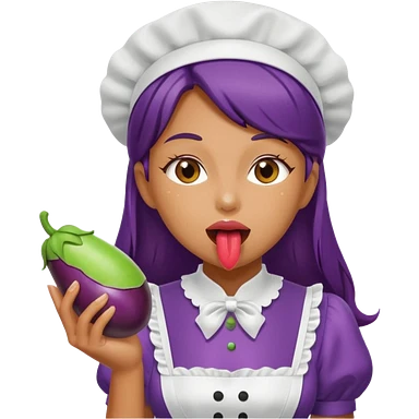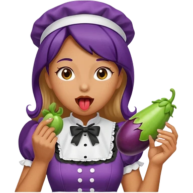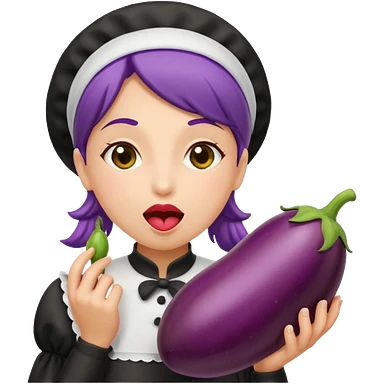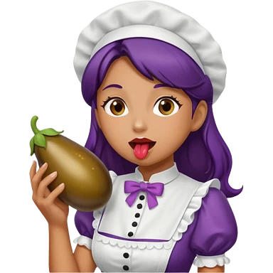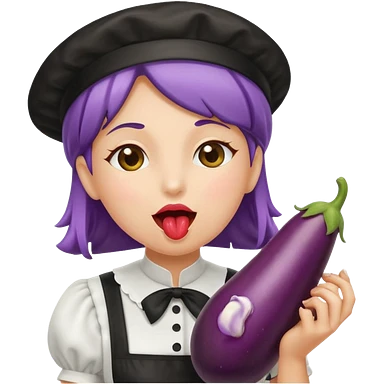 A women in a black and white maid dress with her lips around a wet eggplant emoji