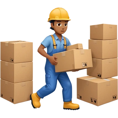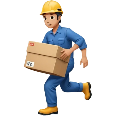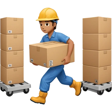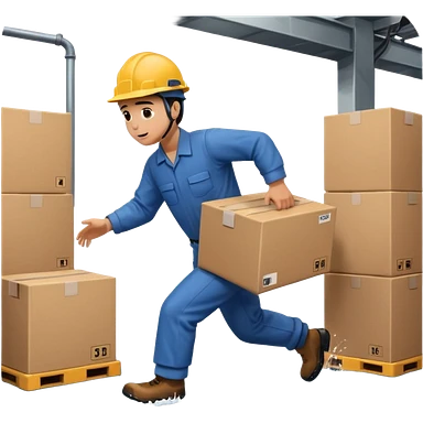Animación educativa sobre un accidente laboral en un entorno industrial. Un trabajador de fábrica, con casco pero sin otros elementos de protección personal, resbala en un piso mojado y cae al suelo mientras transporta una caja. emoji