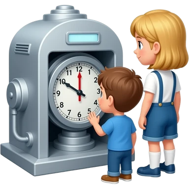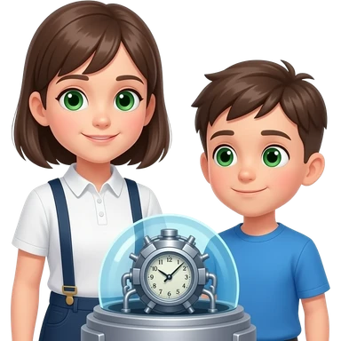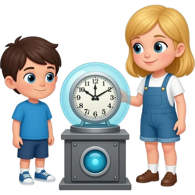 una maquina del tiempo rodeada por dos hermanos un chico i una chica los dos castanyo i la chica un poco rubia (la chica mas grande que el i con ropa blanca con tirantes) i el chico con ropa azul) los dos estan mirando la maquina realista emoji