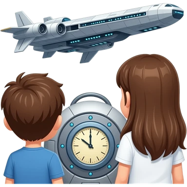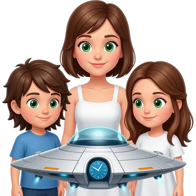 una maquina espacialcon un reloj en el medio rodeada por dos hermanos un chico con el pelo corto i una chica los dos castanyo i ojos verdes (la chica mas grande que el i con ropa blanca el pelo muy largo ) i el chico con ropa azul ) los dos estan mirando la nabe espacial muy grande i solo dos niños emoji