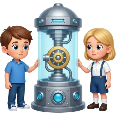 una maquina del tiempo rodeada por dos hermanos un chico i una chica los dos castanyo i ojos verdes (la chica mas grande que el i con ropa blanca con tirantes) i el chico con ropa azul) los dos estan mirando la maquina realista que se pueda entrar dentro emoji