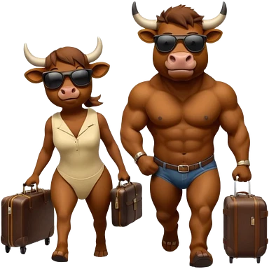 generate an emoji of a group of up to 8 male and female bulls travelling together on holidays. Include sunglasses and suitcases emoji