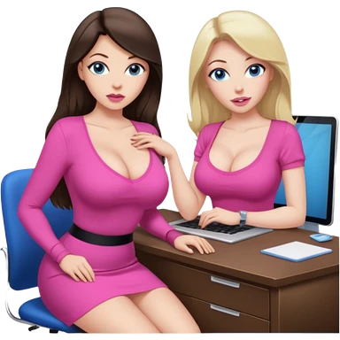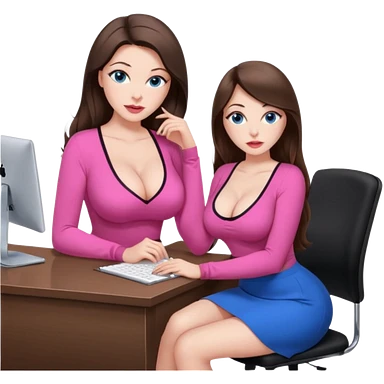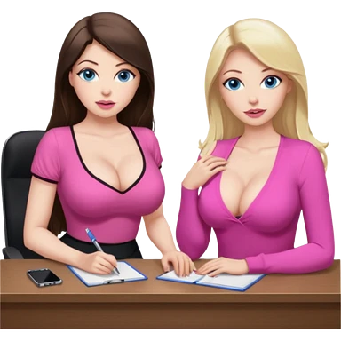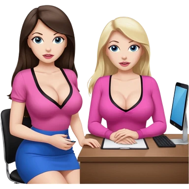 sexy woman brunette, very large breasts, pale skin, blue eyes, long brown hair, tight pink low cut blouse, big pink lips, short black skirt. at desk next to similar blonde woman. emoji