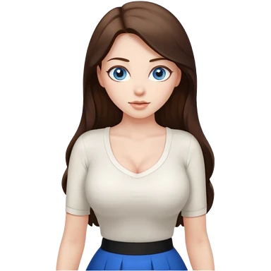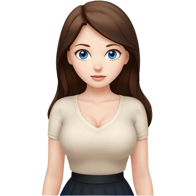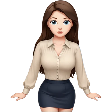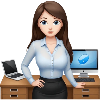 sexy woman brunette, very large breasts, pale skin, blue eyes, long brown hair, white blouse, short black skirt. office. emoji
