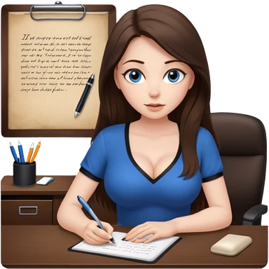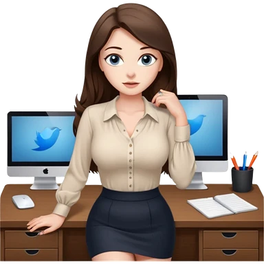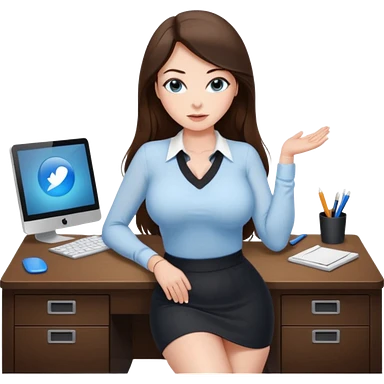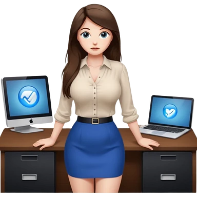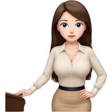 sexy woman brunette, very large breasts, pale skin, blue eyes, long brown hair, tight white blouse, short black skirt. at desk emoji