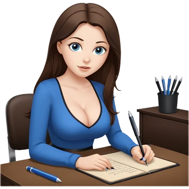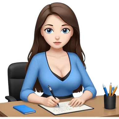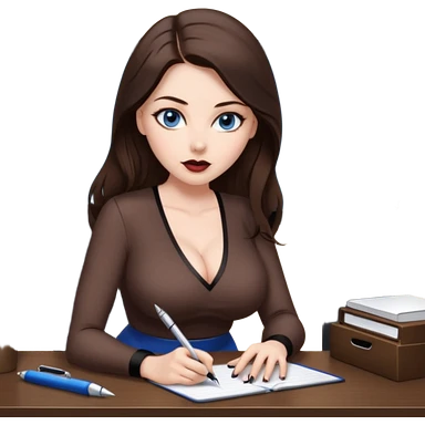 sexy woman brunette, very large breasts, pale skin, blue eyes, long brown hair, tight pale low cut blouse, short black skirt. at desk emoji