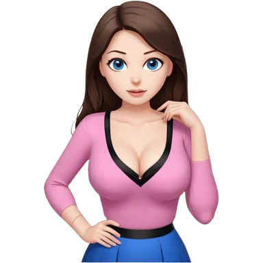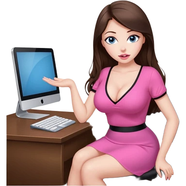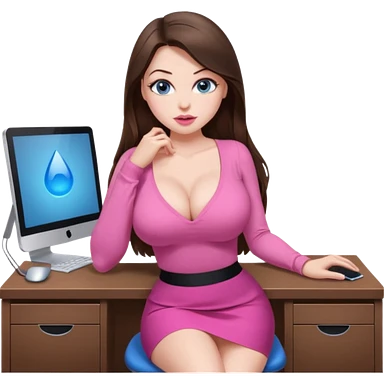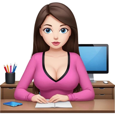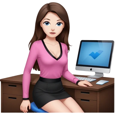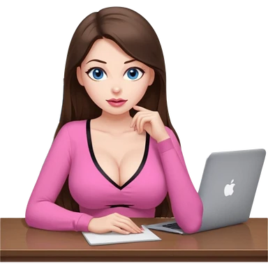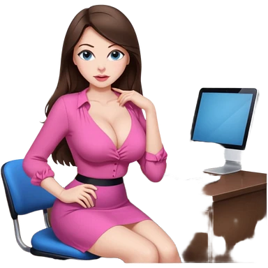 sexy woman brunette, very large breasts, pale skin, blue eyes, long brown hair, tight pink low cut blouse, big pink lips, short black skirt. at desk emoji