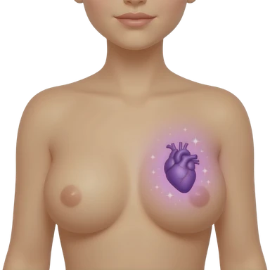 iOS-style emoji of close up of a human torso with an little anatomical purple heart in the chest, soft pink-purple aura with sparkles, smooth gradients, glossy finish, minimal details, neutral background. emoji