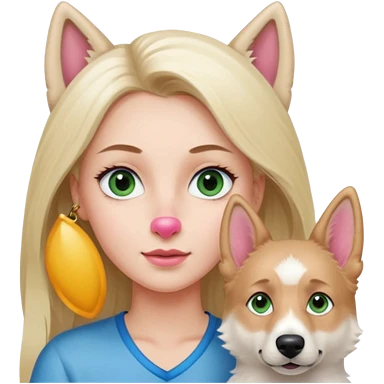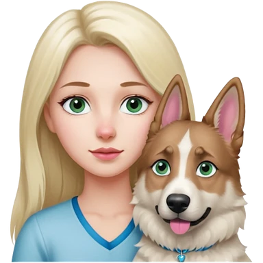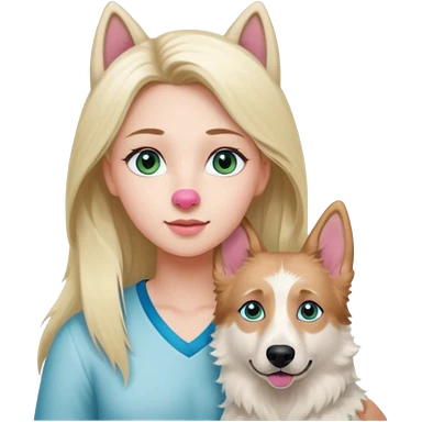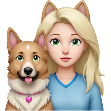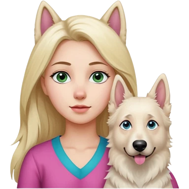 White European young woman with blue-green eyes and long blond hair with her white German Shepherd dog,the Dog has a pink nose and short fur and Brown eyes emoji