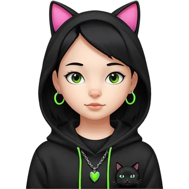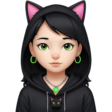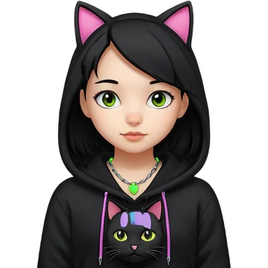 후드티 입은 초딩여자 아이. 검은색 후드티와 검은 머리. 목에는 검은 네온 고양이 emoji