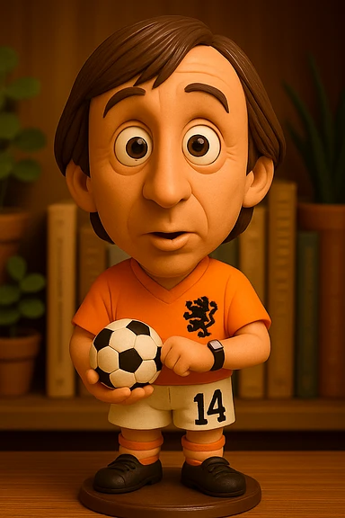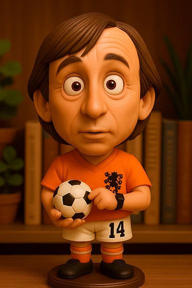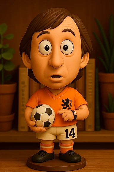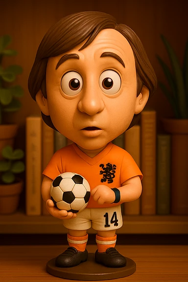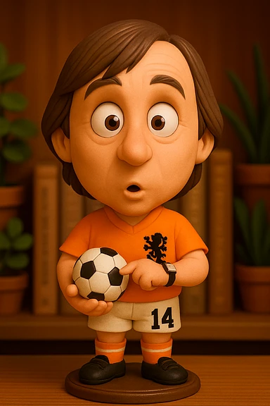 молодой Йохан Кройф в форме команды нидерландов образца 1974 года смотрит прямо на зрителей. левая рука на бедре, правая рука опущена вниз. цвет майки оранжевый. шорты белые, и гетры оранжевые. на его шортах изображен его номер - 14 emoji